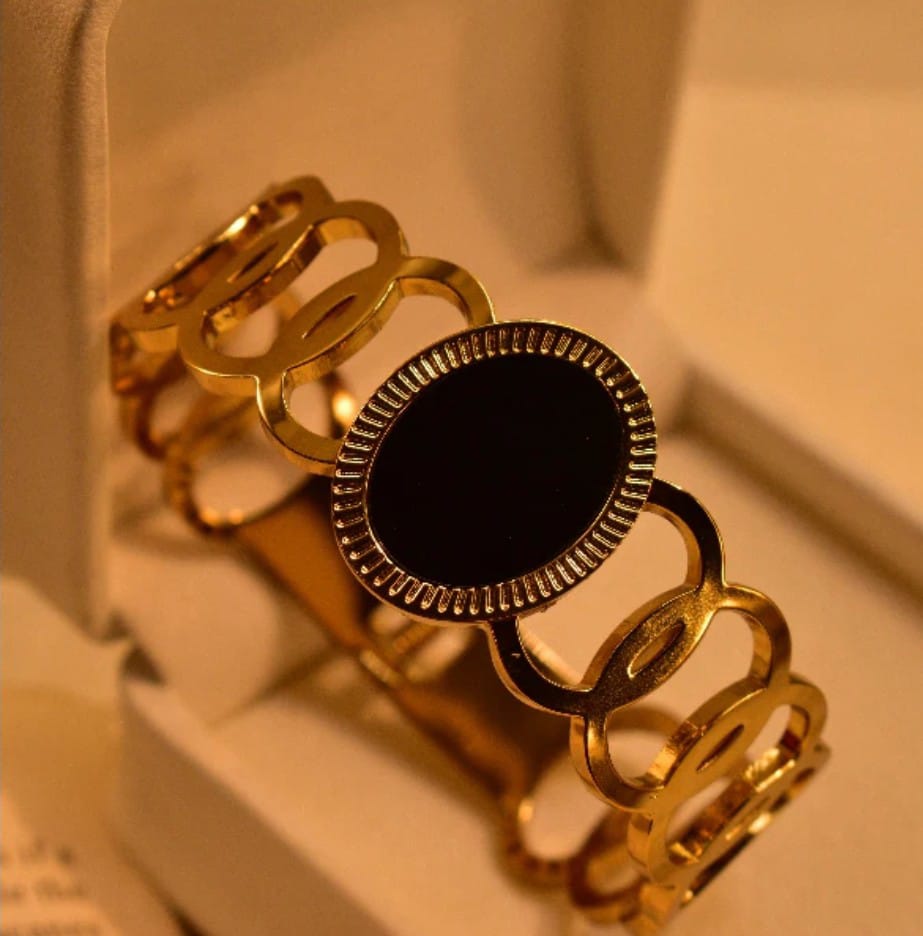 šš²š»šš²šæš½š¶š²š°š²: Large black oval stone, rimmed with a textured golden frame for a statement look.