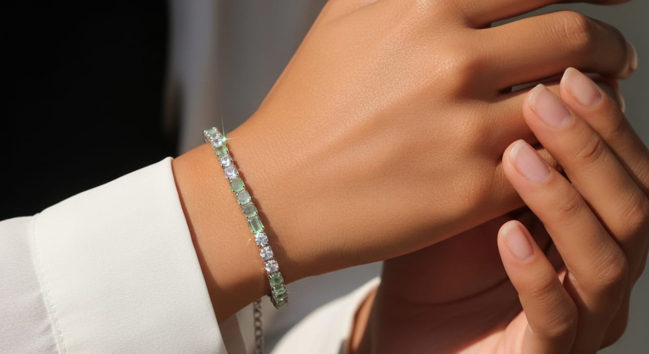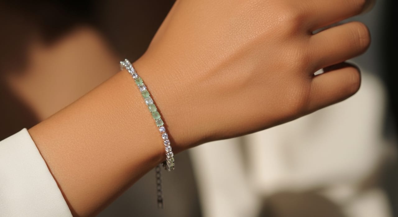 Design: Sleek tennis bracelet with emerald-cut green stones.